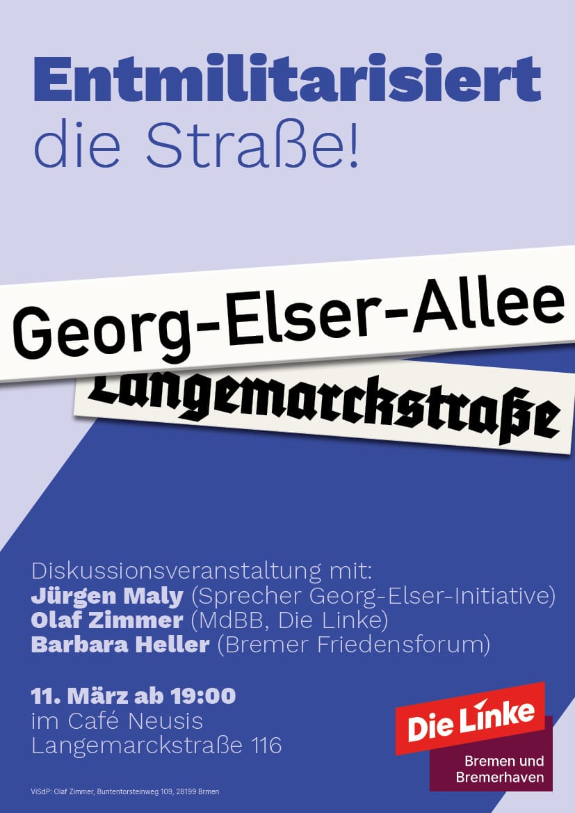 Als Beitrag für die engagiert geführte Debatte in der Bremer Neustadt um die Umbenennung der Langemarckstraße (die am Vorabend des Zweiten Weltkriegs, erinnernd an den „Mythos von Langemarck“, von den Nazis so benannt wurde)in Georg-Elser-Allee habe ich für den Linke Kreisverband Links der Weser dieses Plakat entworfen.